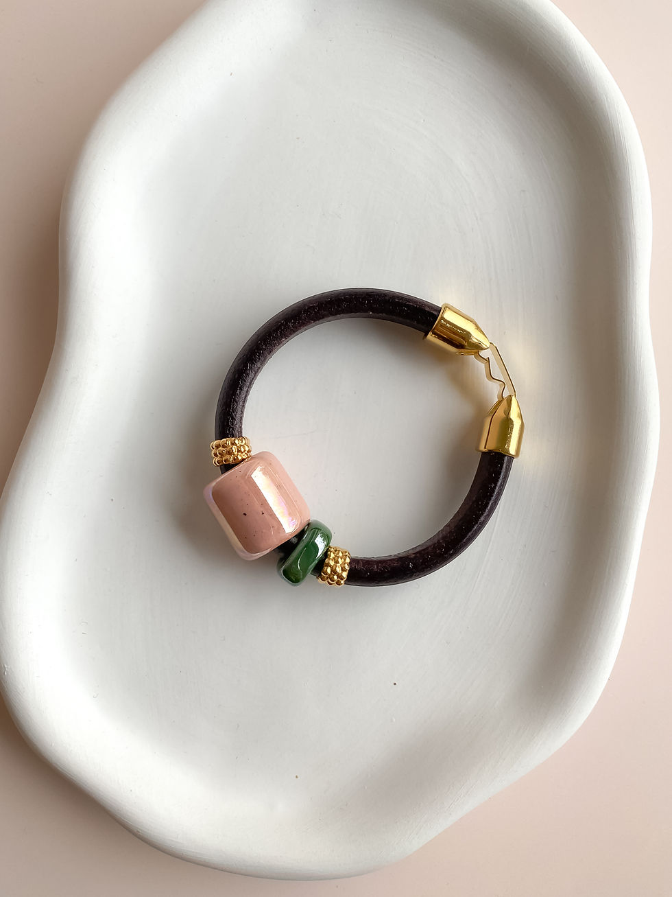 Beige and Water Green handmade ceramics on brown leather bracelet gold finishingB- Heart Wild by Greek Collection | Beige & Green Aqua Bracelet1 350,00 KčPriceWirst size in cm ( i.e 15.5 cm )*0/500Quantity*Add to Cart